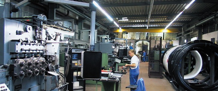Линия переносит их в камеру окрашивания, a работник снимает с крючков готовый элемент. Линия движется в невысоком темпе.