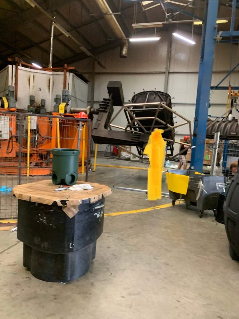 Металева форма закладається на машину, в формі потрібно по колу закрити засувки. У форму засипається гранульований пластик, закривається форма і включається піч-машина. Після близько 30-40 хвилин форма готова, засувки відкриваються, верхня частина форми знімається за допомогою підйомника, дістається готова форма. Оператор може обслуговувати близько 2-3 машин